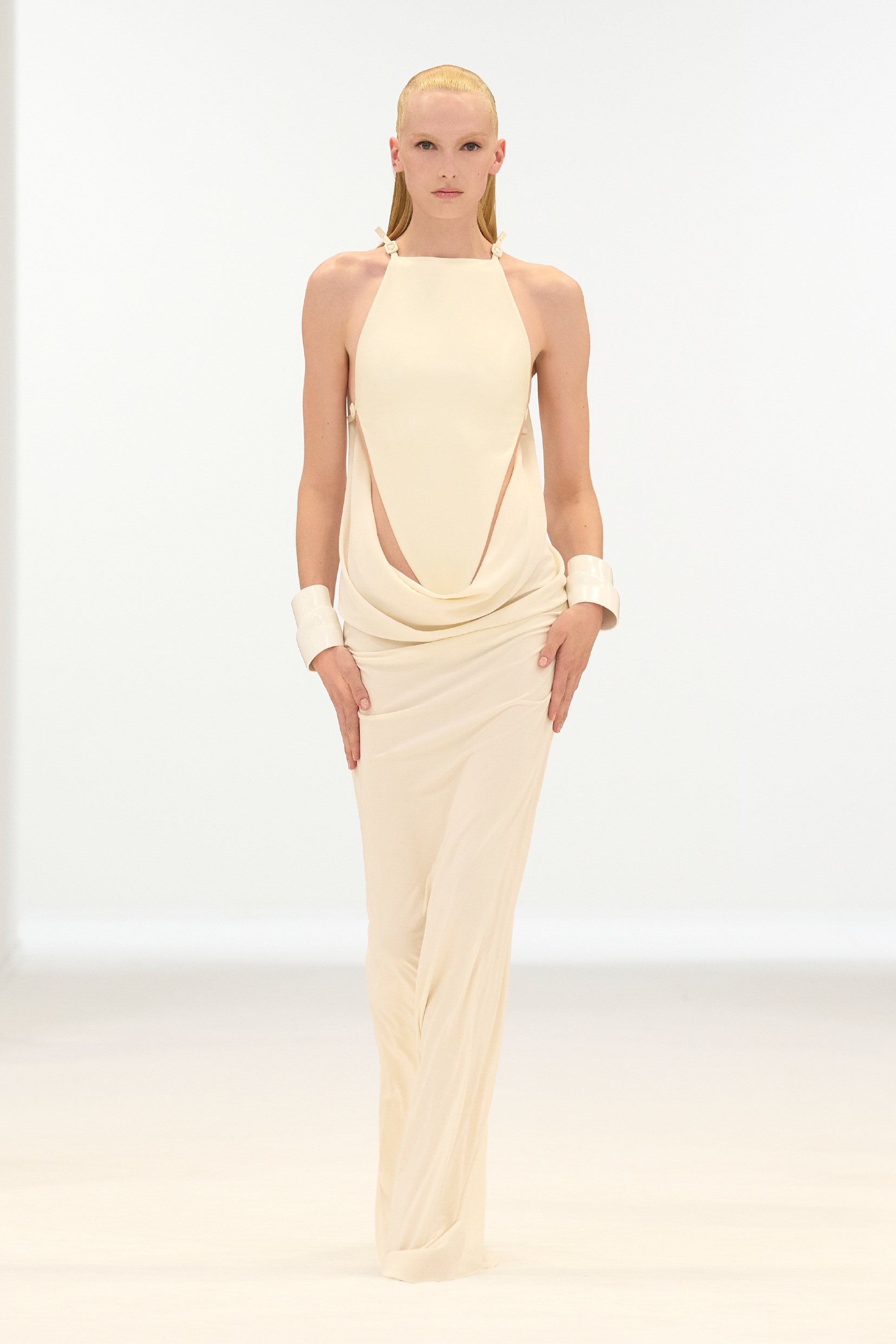 Heat, in Di Felice’s vision, became a metaphor for transformation. “When the sun is too bright, everything begins to blur,” he noted. This idea materialised in garments constructed from slender, shimmering straps evoking reflections, dampness and the sense of matter slowly melting. As the temperature on the runway rose from 22°C to 30°C, the palette shifted from cool, icy blues to sun-drenched tones, while fabrics gradually lightened, turning translucent before fading entirely.