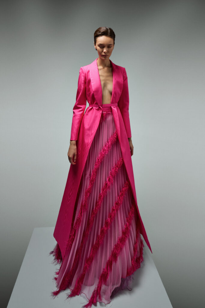 His strong sartorial vocation is combined with modern reinterpretations and unconventional visions that lead to unexpected shapes. Unstructured dresses thus become the identifying feature of his collections. The result is a pure fusion of styles, colours, techniques and materials. Martin Alvarez, a master in the selection of colours and fabrics and a tireless experimenter with new shapes and cuts artfully moulded to feminine lines, collaborates alongside Carmine De Santis and his exclusive tailored fur creations to create a new concept of contemporary luxury.